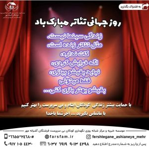 این روز فرصتی است تا ارزش والای هنر نمایش را در یادها زنده کنیم و با قدردانی از هنرمندان، بر فرهنگ، اندیشه و همدلی نماییم. صحنه ای باشید که همیشه روشن باشد و پیامآور صلح، دوستی و امید برای جهانی بهتر باشد 🌍✨.