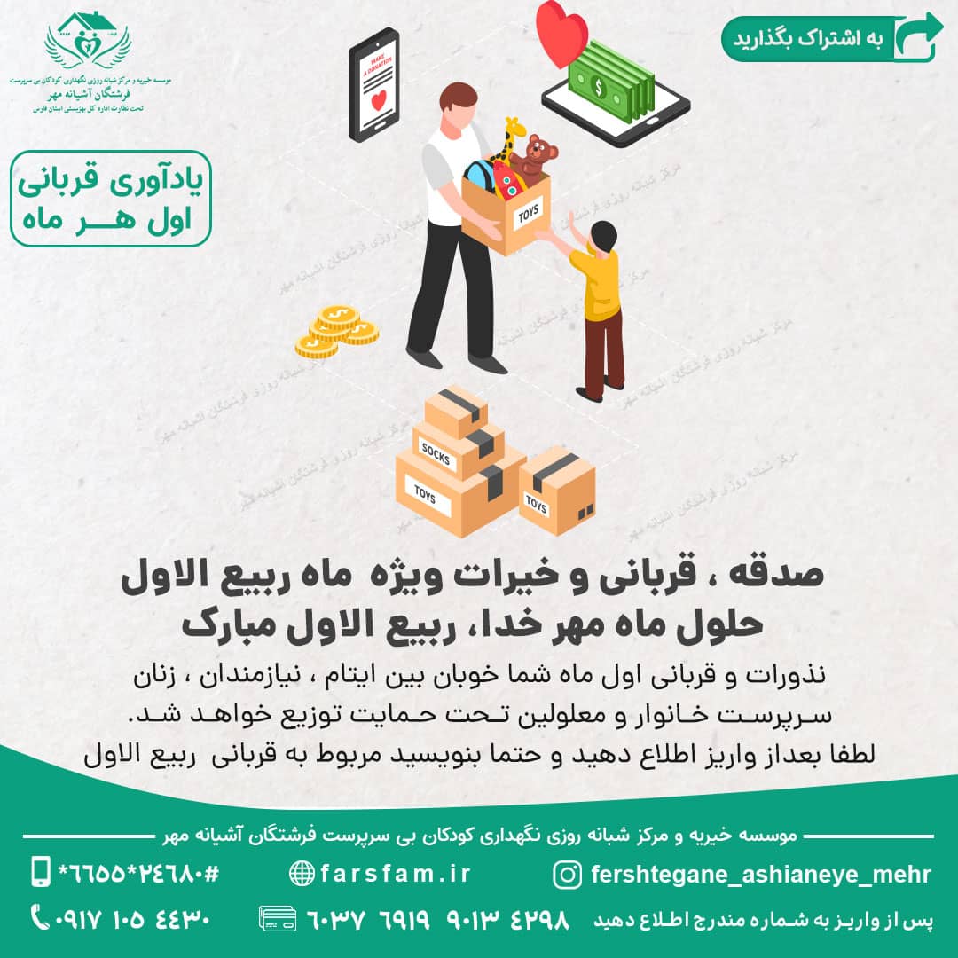 – کمک به یتیمان و مستمندان در این ماه بسیار مورد تأکید قرار گرفته است. با فراهم کردن نیازهای اساسی آنها مانند پوشاک، غذا، و حتی حمایتهای آموزشی و مالی، میتوان دلهای آنها را شاد کرده و از برکات این عمل بهرهمند شد.