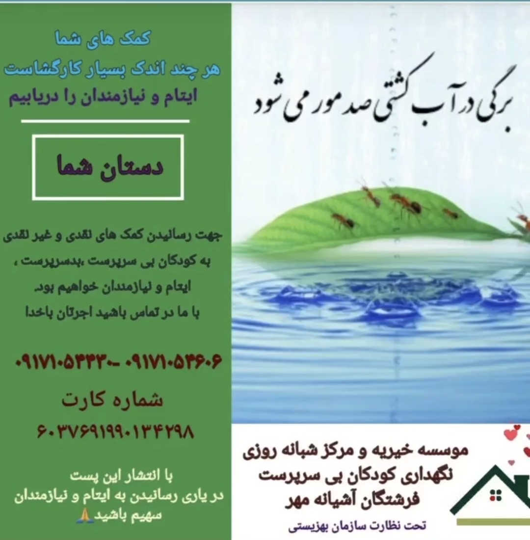 یک برگ کوچک، اگر در مسیر درست بیفتد، می‌تواند جان صدها مور را نجات دهد. همانطور که یک حرکت کوچک از سوی شما، می‌تواند زندگی ده‌ها انسان را تغییر دهد. در نگاه اول شاید کمک‌تان ساده به نظر برسد، اما در دل نیازمندان، معجزه‌ای بزرگ رخ می‌دهد.