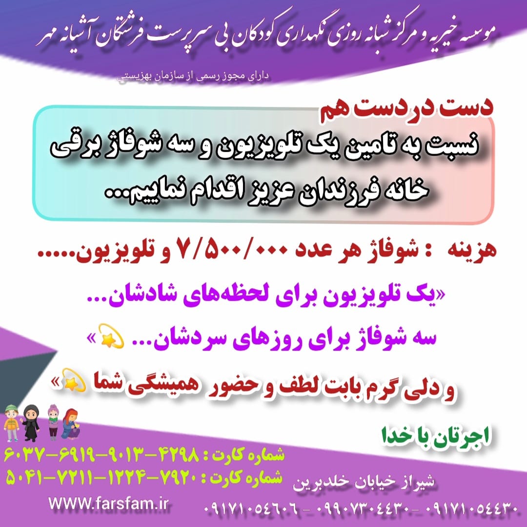 با کمک شما سه شوفاژ برقی و یک تلویزیون برای کودکان بیسرپرست تهیه میکنیم.