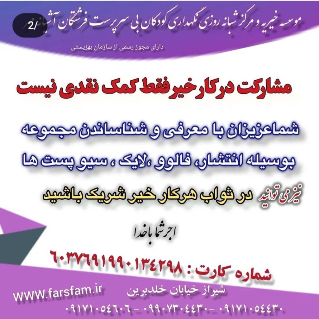سلام وقت شما بخیر به اطلاع شما خوبان می رساند موسسه خیریه و پرورشگاه فرشتگان آشیانه مهر در بخش های زیر با کمک های افراد خیر فعالیت دارد نگهداری از کودکان بی سرپرست به صورت شبانه روزی در سه مرکز (پرورشگاه )مرکز مثبت زندگی شامل ۴۵۰ خانوار دارای معلول که بعضا تا ۳ معلول ذهنی […]